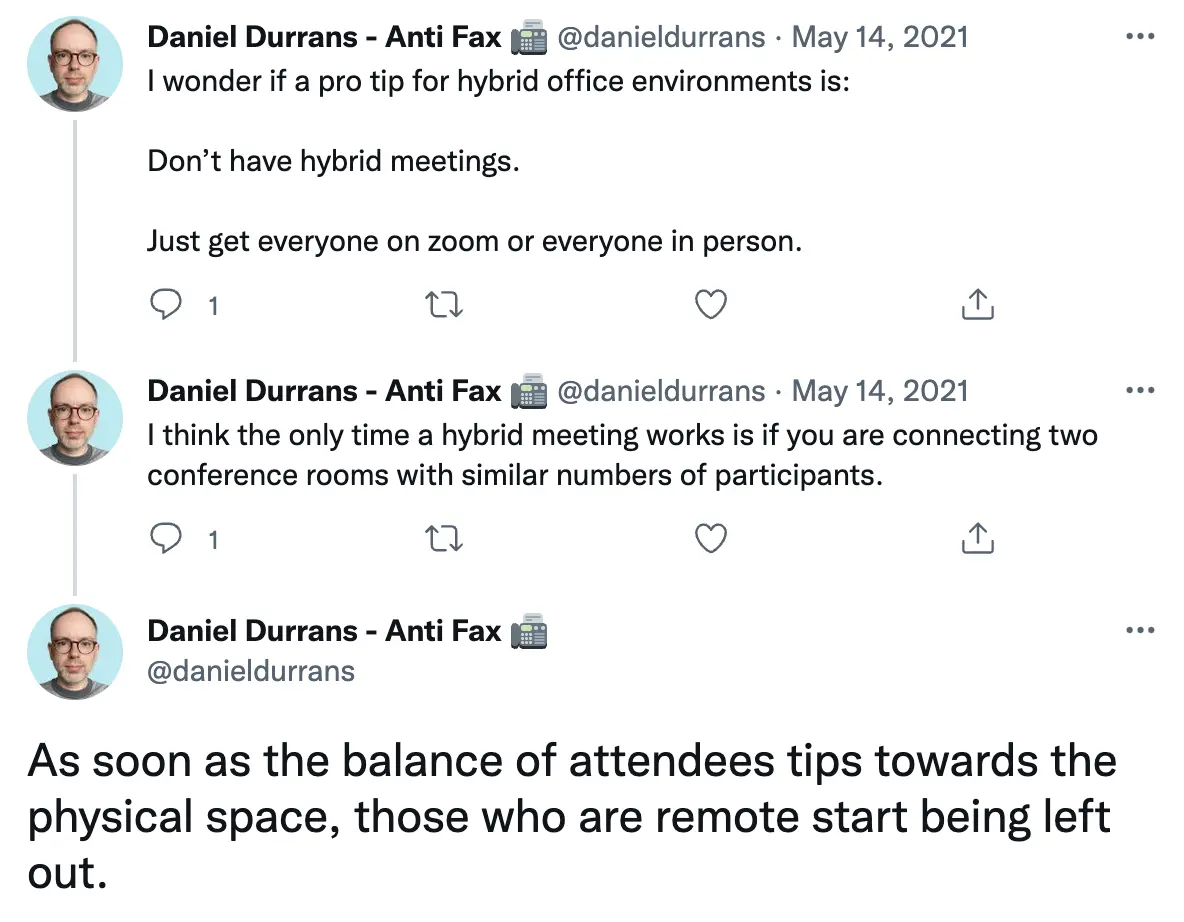 You're not alone in wondering that. In fact, Daniel Durrans asked that very question: “I wonder if a pro tip for hybrid office environments is: Don’t have hybrid meetings?”